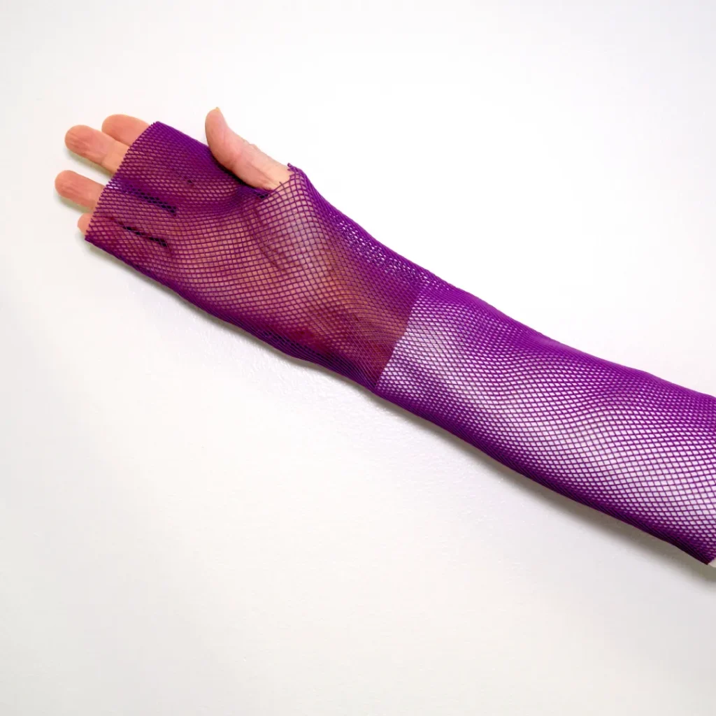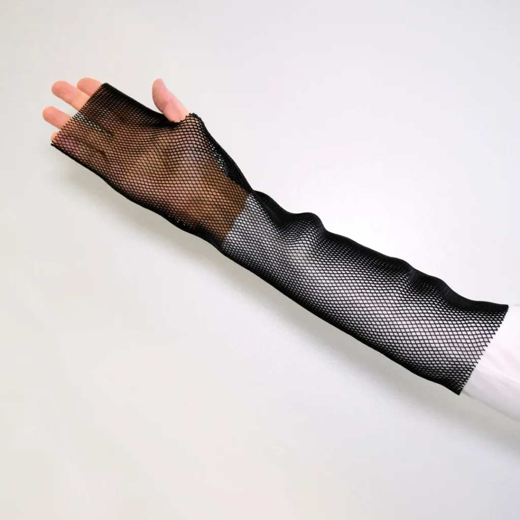 Grip Ribbon can be used in maintaining posture of a stroke patient. It helps to increase the user’s functional capacity and independence. Posture therapy and active rehabilitation go hand in hand in the rehabilitation of stroke patients. Grip Ribbon is used in the hand to increase friction between contact surfaces, e.g. with a tube strip. when eating or moving with the help of an assistive device. Grip Ribbon is structured as a mesh-like, breathable tube that adapts to the shape of the hand. You can cut a hole for the thumb at the point appropriate for the purpose. The reticulated structure of the product does not unravel.